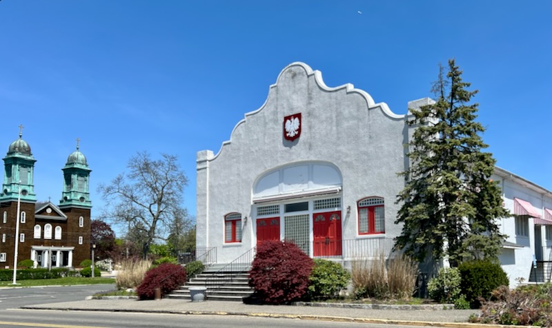 Riverhead Polish Hall on Marcy Avenue in Riverhead. St. Isidore’s Church is in the background. RiverheadLOCAL/ Denise Civiletti
